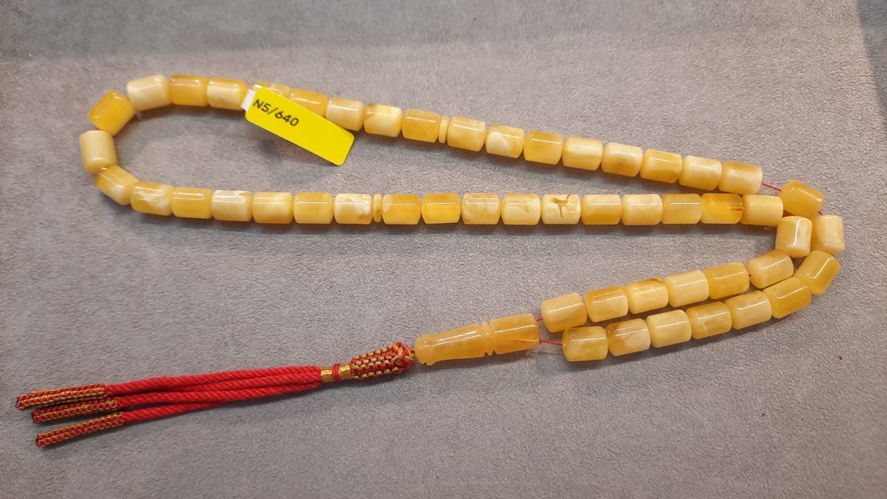 طقم خرز صلاة كهرماني طبيعي جميل يزن 63.7 جرام، يضم 51 خرزة بحجم 10.5 × 13.7 ملم. مثالي للطقوس الروحانية أو كقطعة تُقتنى كقطعة فنية. السعر: 3200 درهم إماراتي.