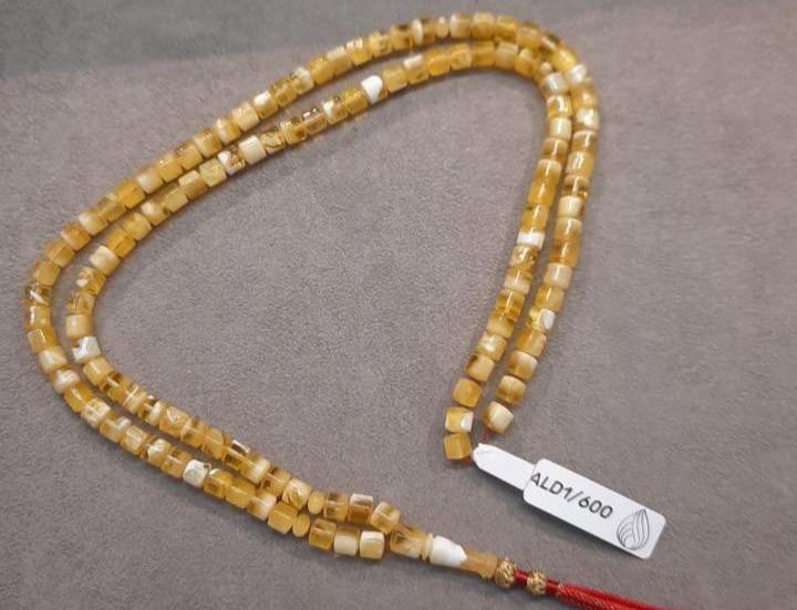 مسبحة كهرمان طبيعي خفيفة الوزن تزن 31 جرام، تحتوي على 119 حبة بحجم 7×6.5 مم. خيار مناسب للميزانية للاستخدام اليومي. السعر: 300 درهم إماراتي.